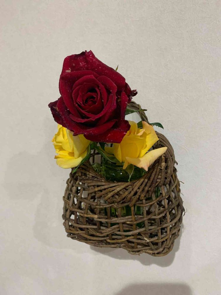 🌹朝、赤いキャラミアと黄色と少しオレンジ色が入ったモナリザが咲いたので