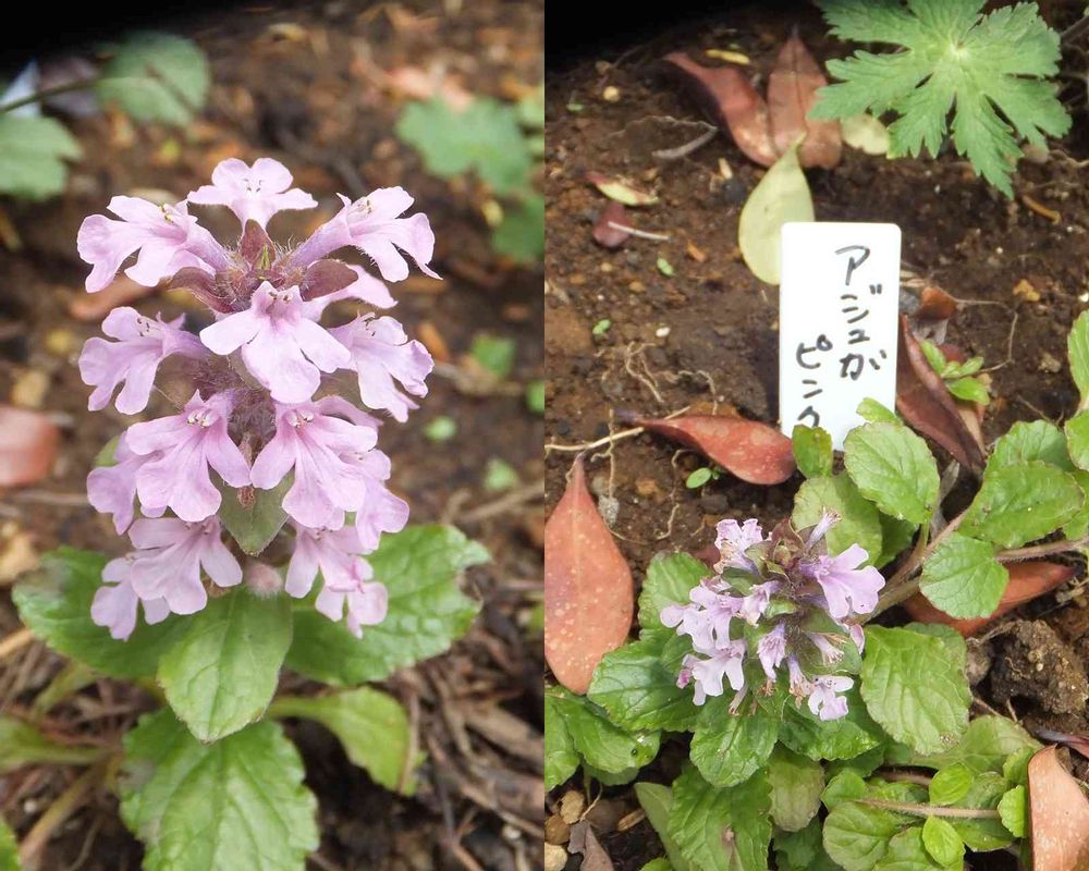 歩道に面した植え込みにピンクの「アジュガ」がありました。 パチリ