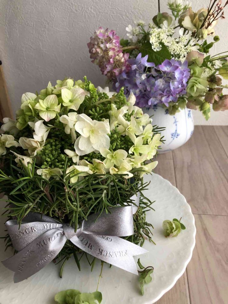 先日シュネープリンセスとマルゴズシスター、青リンゴを挿していたアレンジに今日は「かしわばあじさい」を挿してみました。これも好き💕