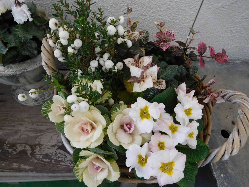 雪❄️降りの中の寄せ植え💕の入れ替え((+_+))雪❄️にあった白い綺麗な花たちだゎ😍