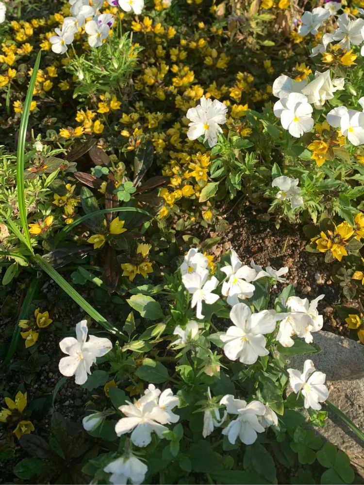 終わりかけのビオラ、アジュガのゾーンに、どんどん侵食していったリシマキア🌱が花を咲かせて賑やかになりました。