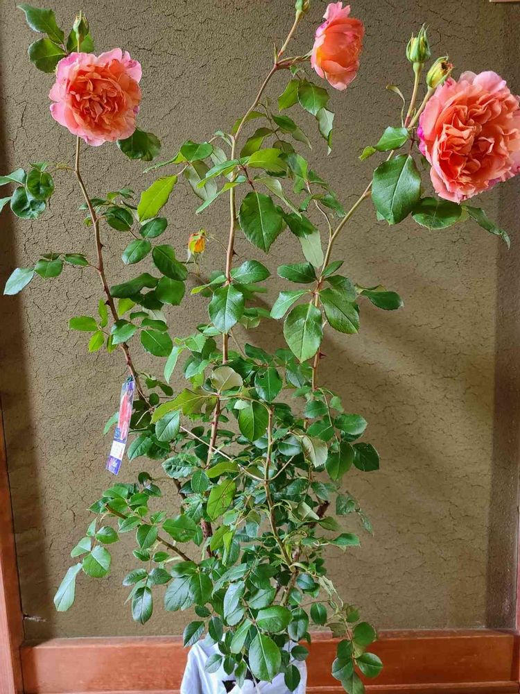 初めての大苗になるのかな?薔薇が京阪園芸ガーデナーズから我が家にやって来ました。つるバラです。大好きなアプリコットカラーで新芽の棘が赤く美しい