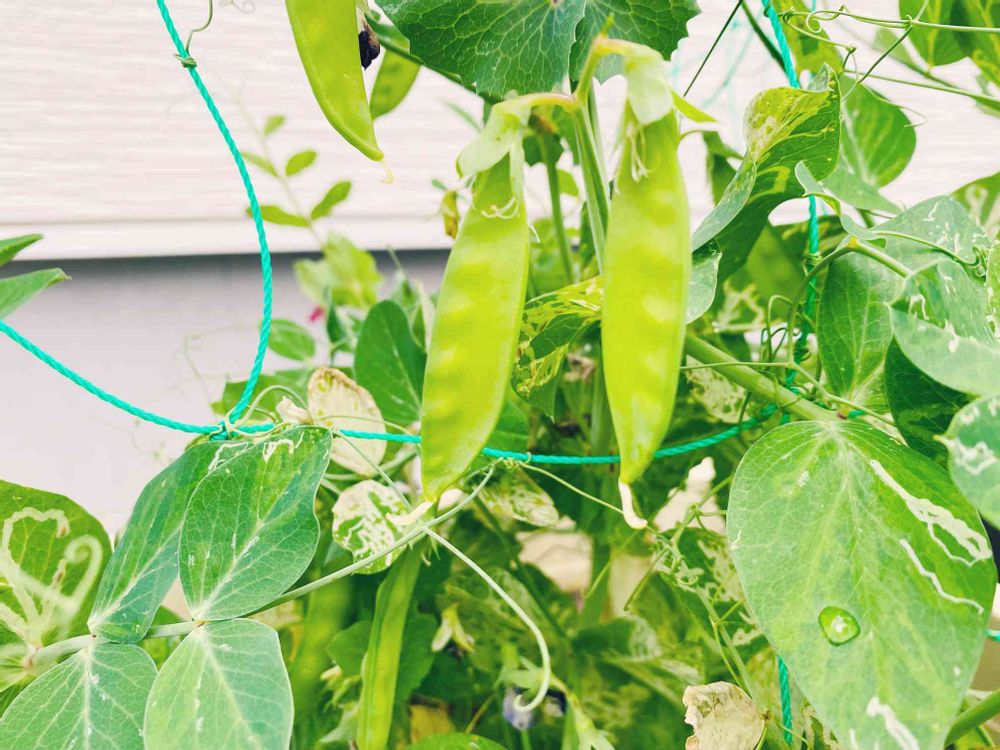 今年の家庭菜園最初の収穫はスナップエンドウです◡̈*.。