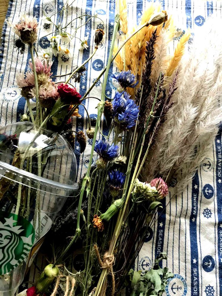 そこら辺で取ってきた雑草やカーネーション、ノースポール、ユーカリなどドライフラワーにしました‼️
