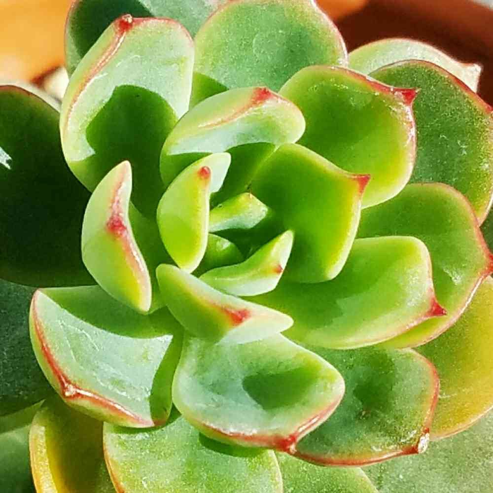 エケベリア ハッピー。ふちが赤くなって可愛くなりました。…足元は子沢山でどうしましょうって感じになってますけどw