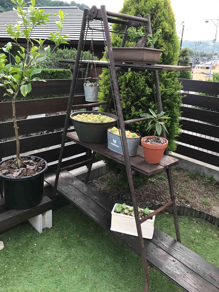 錆びた脚立があったので、これまた古い板材で棚にしてみました(^_^;)