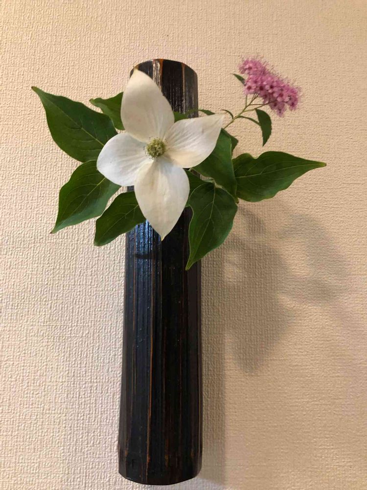 素敵です💕ヤマボウシとシモツケがこの花入にとても映えますね。ヤマボウシ大好きなのですが、うちの小さな庭にはもう植えられないので、お庭にあるのは羨ましいです😊