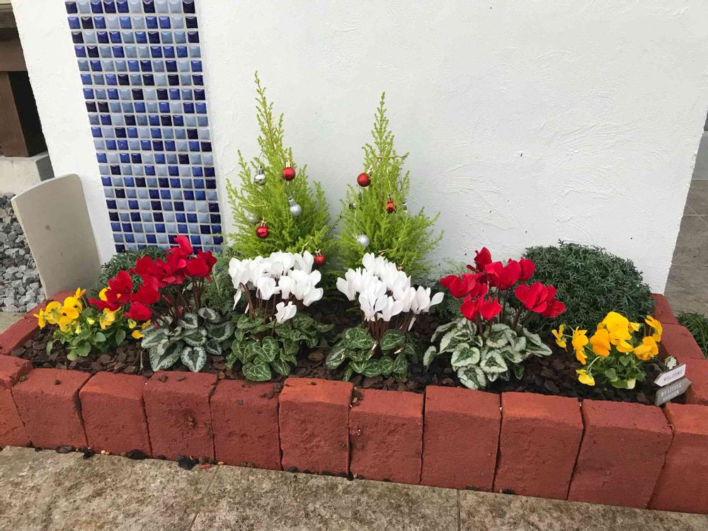 先輩宅の門柱下の花壇を依頼され、夏仕様から、クリスマス仕様に変更してみました!レンガをはめてみたのがいいアクセントになりました( ^∀^)
