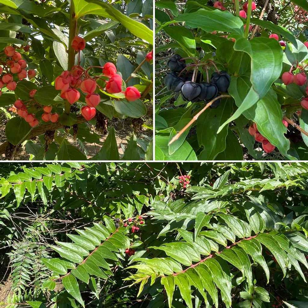 逗子の法性寺、山王大権現五重の塔の脇に生えていた低木?です。赤い実とブルーベリー様の紫色の実がなっていました。名前をご教示下さい。