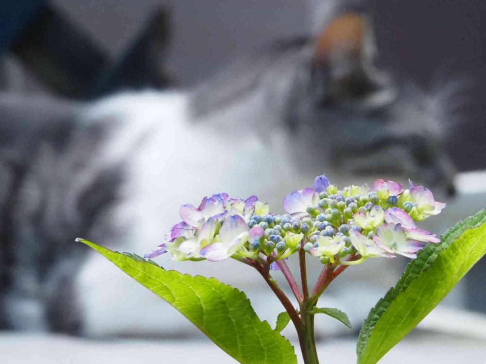 バックのネコちゃんの色合いが、紫陽花を引き立ててるみたいです💞