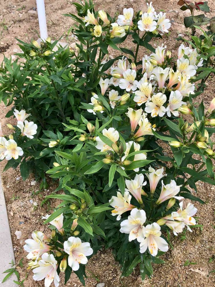 これは職場に地植えの四季咲きアルストロメリア のサマースノー。昨年秋に株分けしました。たくさん咲き始めました。