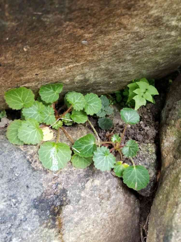 裏庭の石垣にユキノシタと雨宿りしている🌿さん馴染みの🌿さんですが名前が分かりません‼