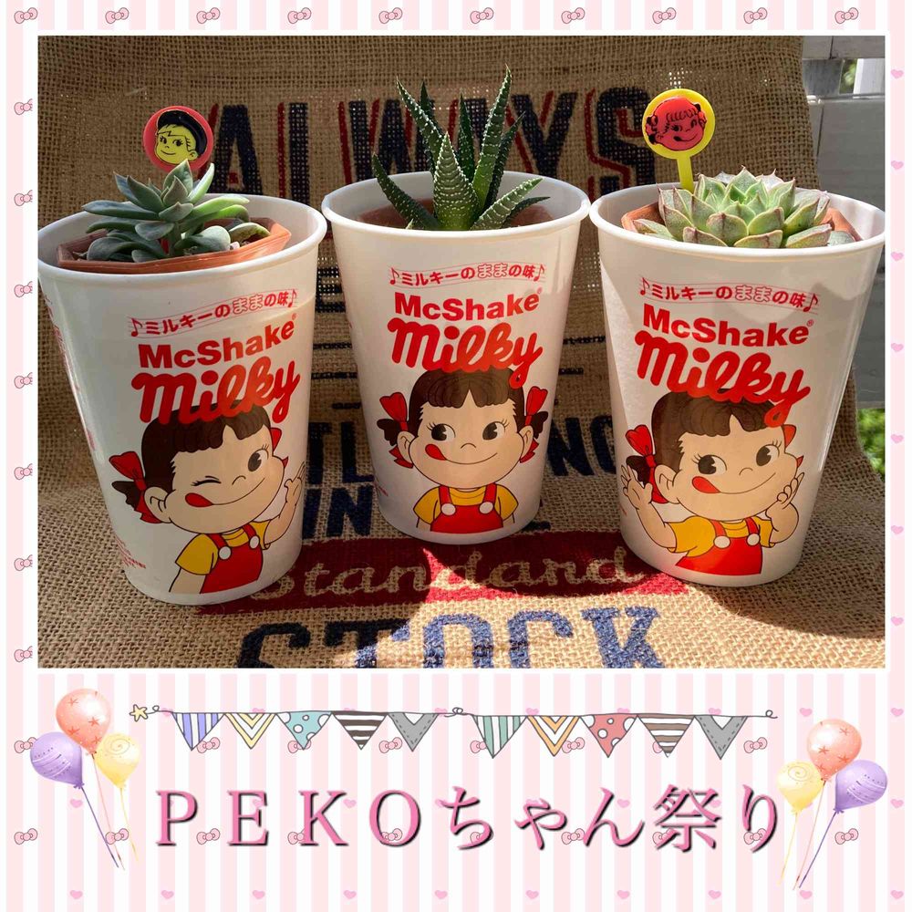 ペコちゃんのイラストも違う事に気づいたら3つ共取っておきたくなって、丁度3つあった100均の多肉ちゃんのサイズにぴったりでした(〃▽〃)