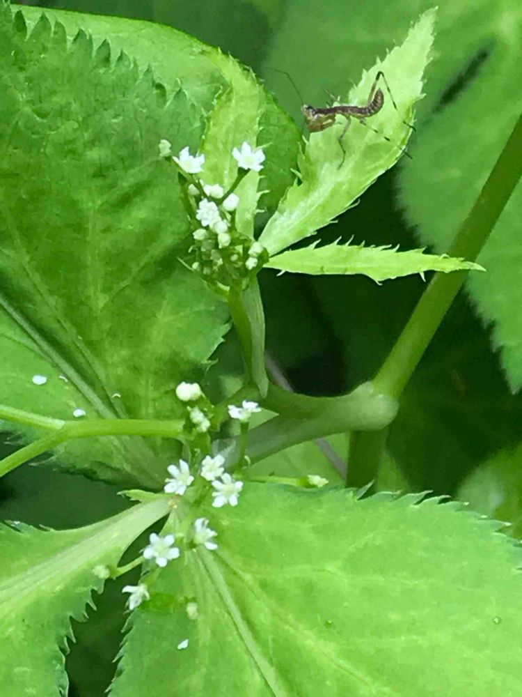 小さなミツバの花、スマホで撮れるかなあ? あれ?カマキリの子が写ってる!