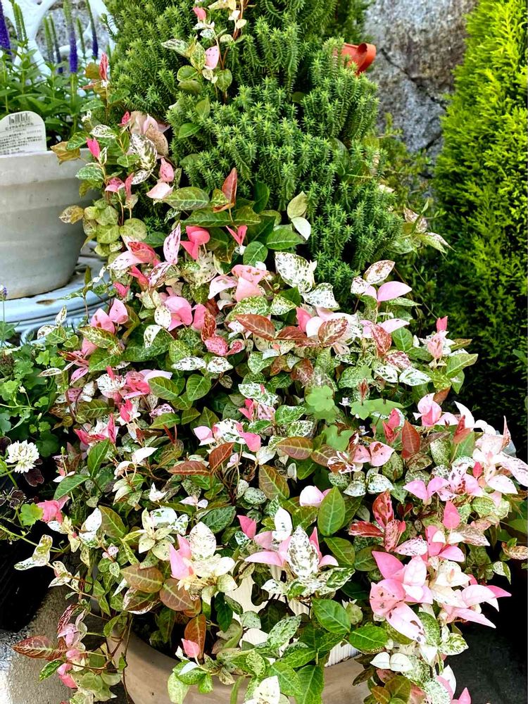 後ろのコニファーのはちの根元に置いたら初雪カズラの根がコニファーの鉢にまで侵入。2個イチで移動しなくちゃいけなくなってしまった💦