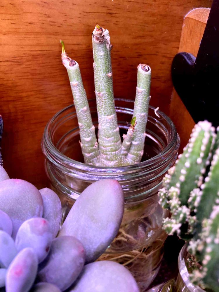 茎が青々としてきて、葉が生えてきたアデニウムソマレンセさんヽ(・∀・)