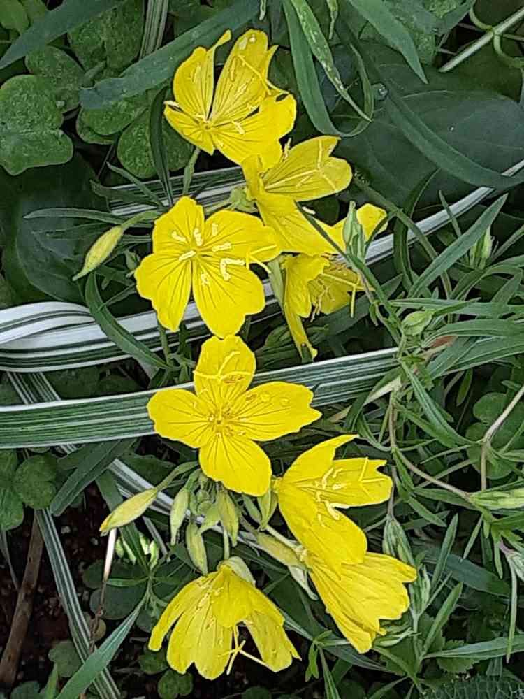 🍋色の可愛いお花が咲きました、細い茎は、カタバミのソファーに、ミスカンサスの🌱をクッションにして、居心地も良さそうです😊💕💕