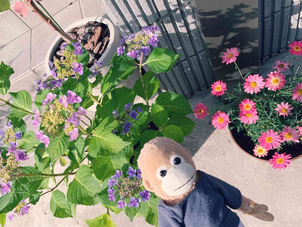 紫陽花とマーガレットが玄関前を明るい色で粧ってくれます。