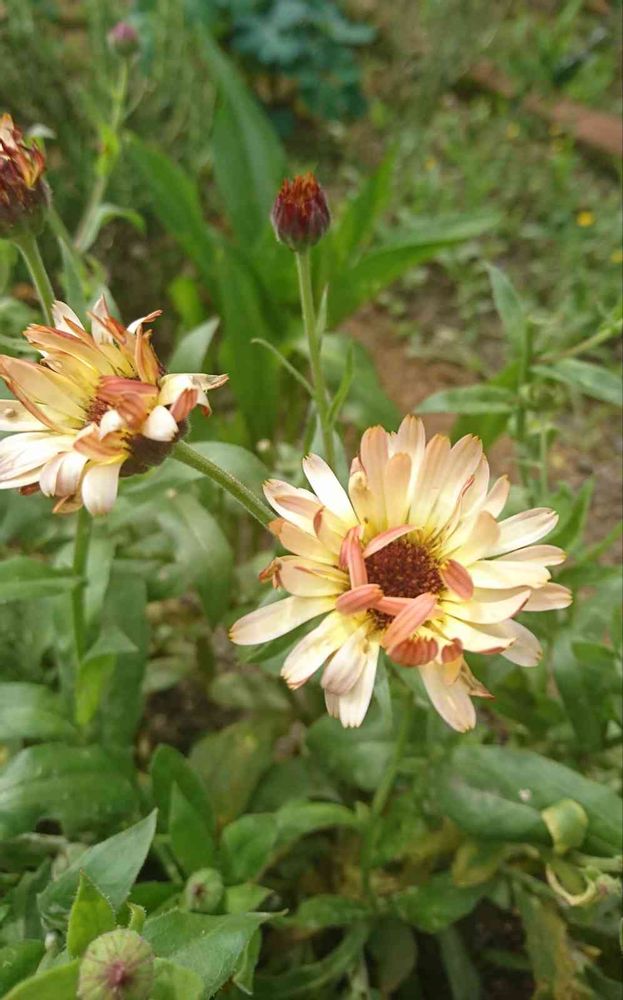 my花壇の カレンジュラさんの背景にピンクのカラーさんの芽が 今年も成長中です😋…