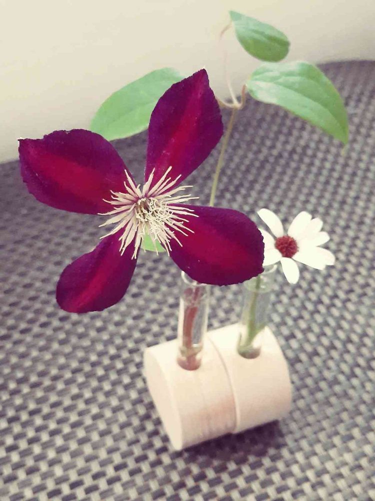カットしたクレマチスと色褪せてしまったローダンゼマムを一輪挿しに飾りました。