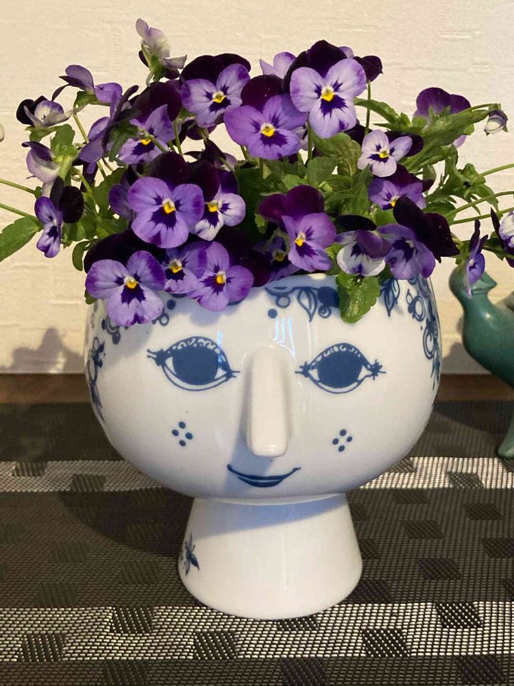ビオラの紫色と、フラワーベースの青色が、大人っぽくて素敵です🍷🎩✨