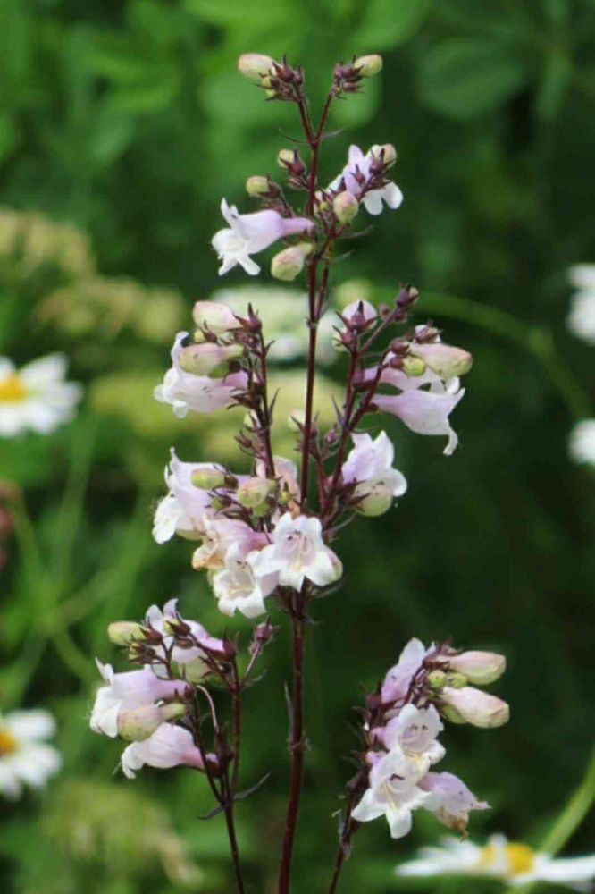 ペンステモンはオオバコ科ツリガネヤナギ属(ペンステモン属)の総称で、多くの園芸品種がある。釣り鐘形や筒状でふっくらした形の愛嬌のある花が連なるように咲く。長い穂状に咲くものや房状に固まって咲くものなどバラエティに富み、花色も豊富。ペンステモン ハスカーレッド、別名ペンステモン・ジギタリス ハスカーレッドは淡いピンクの花とシックな銅葉とのコントラストが美しい。花期6~8月、草丈70~90cmの多年草。