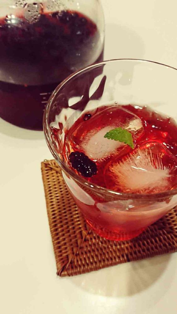 色キレイです〜。すずさん、その後、もっと完熟の真っ黒のクワを収穫したら甘くておいしかったです! なので、氷砂糖ないバージョンのクワ酒も作成中です!