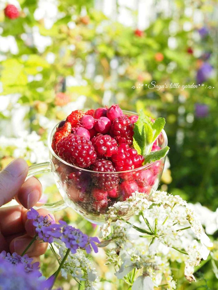 お花達も可愛い〰️❤️沢山収穫できましたね🎵ジャムかな😃⤴️⤴️