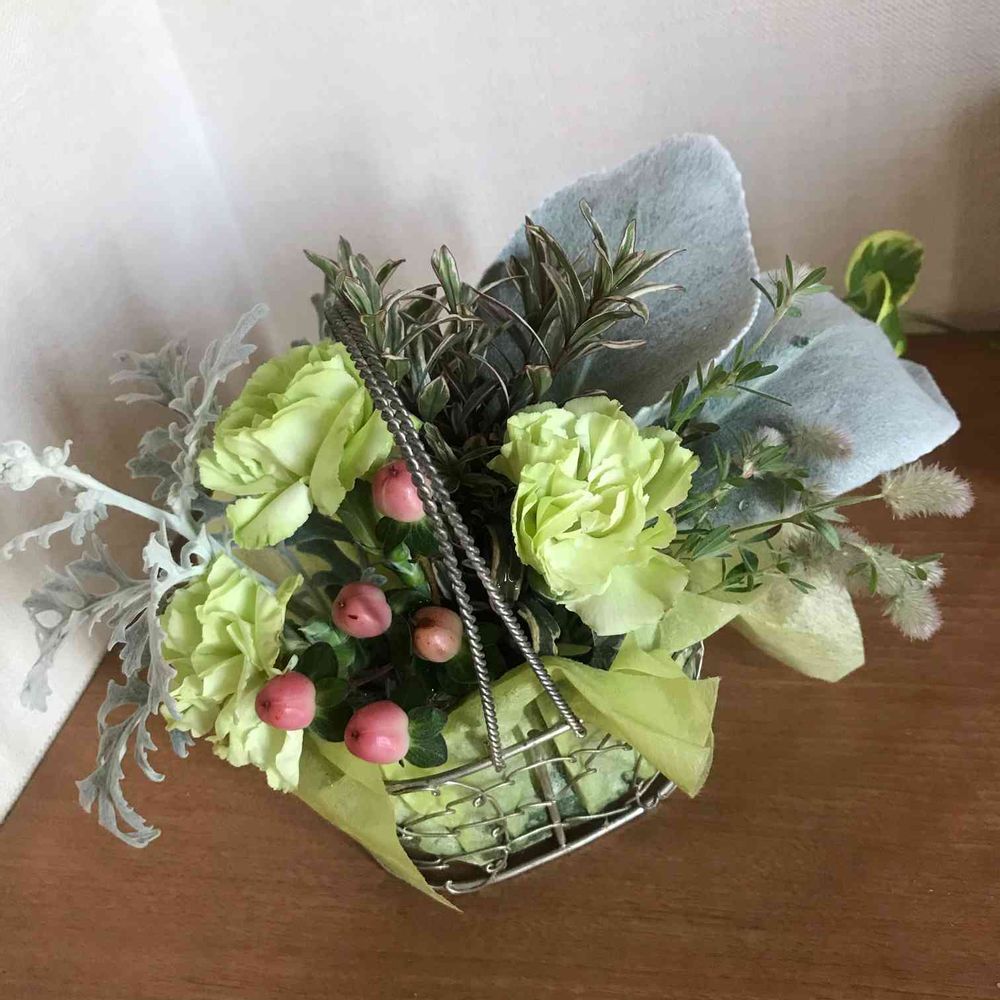 自宅の寄せ植えの切り戻しや、母にプレゼントした切り花のカーネーションなどを組み合わせてプチアレンジメント