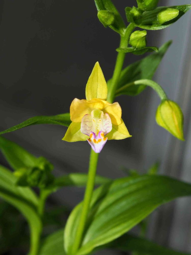 こちらは青軸黄花で唇弁に色素が残っているタイプ。