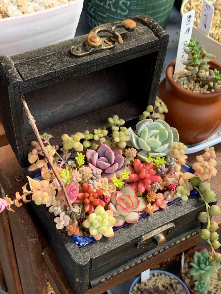 お洒落な宝石箱の器も、色とりどりの多肉さんも、とっても素敵💚で可愛い💛ですね〜