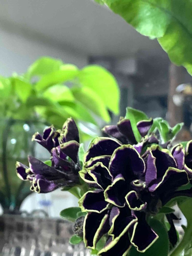 先日、モリモリな姿を願いピンチした、ペチュニア・花衣・黒真珠、ガラス瓶へ飾りリビングへ🌱。