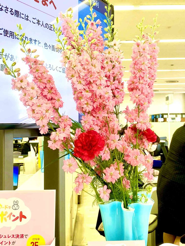 ビンクのデルフィニウムに真っ赤な🌹……じゃなくカーネーション😆