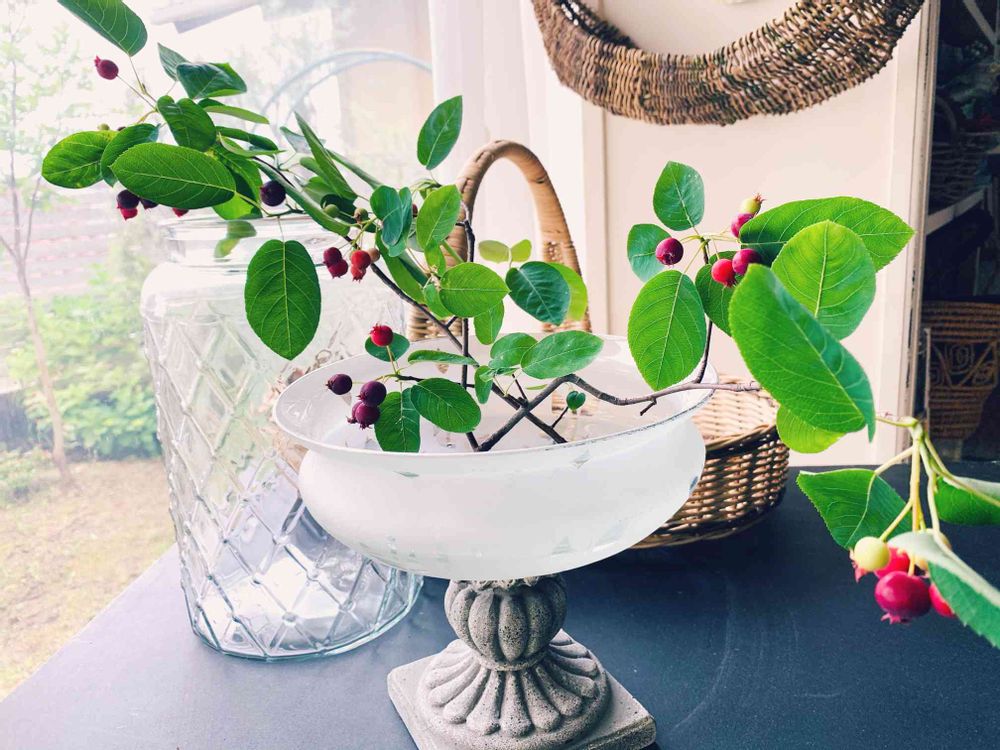 ジューンベリーは、可愛い可憐な花と実のグリーンから変化していく感じが大好きです💜