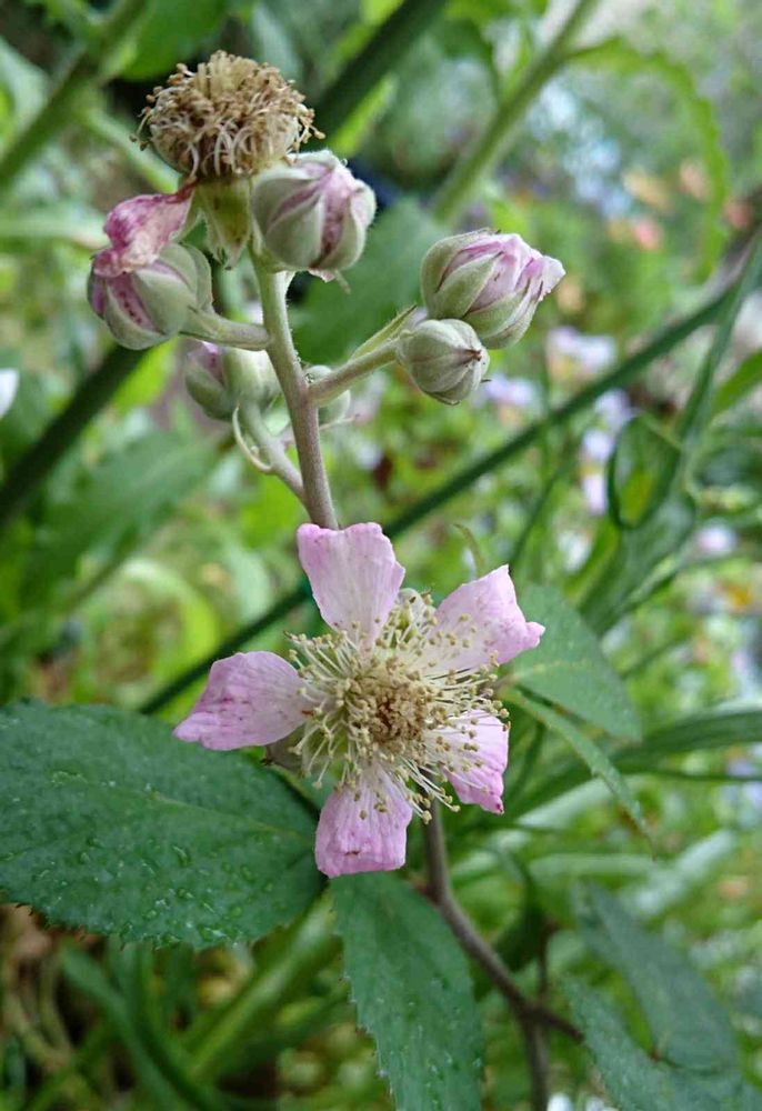 3年目のブラックベリー、場所がないので思いっきり伸ばせず、今年も味見程度の収穫を目標にしていますが、現在可愛いピンクの花が咲いています😊