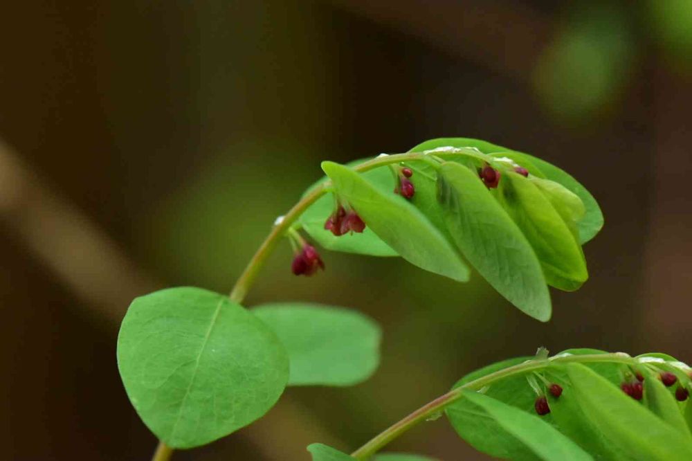 赤紫色の花が雄花です。葉の蔭に咲くのであまり目立たないです。雌雄同株ですが雌花は写っていません。