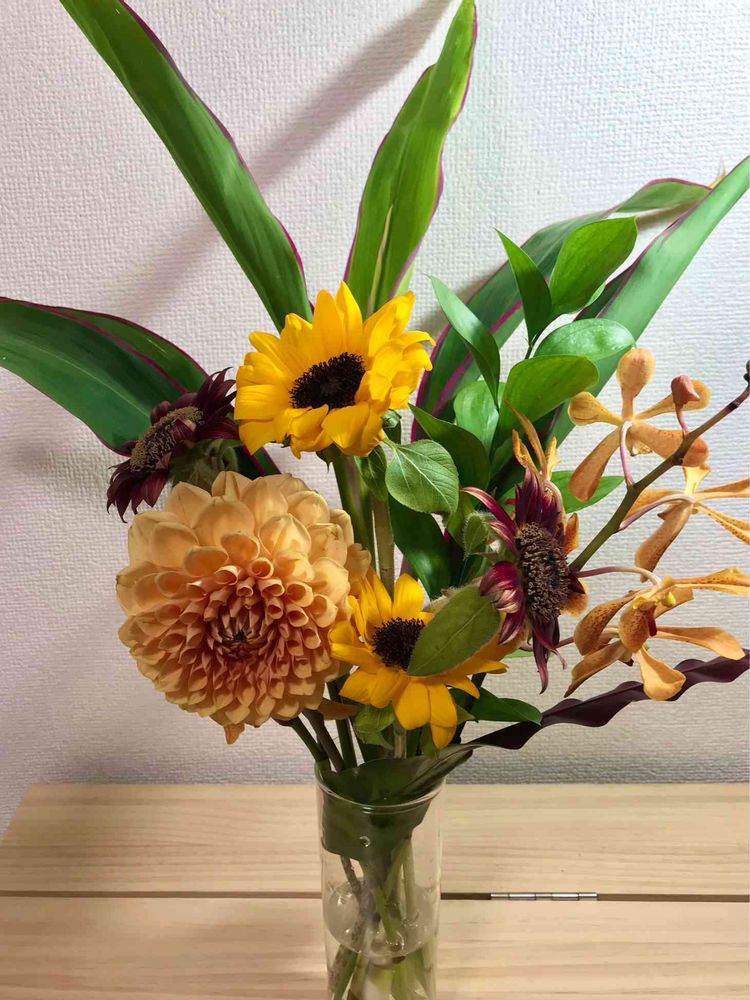 ヒマワリって畑に高く育ってるイメージがあり、机にちょっと飾るには不向きかなと懸念していたけど、意外と違和感なく飾れるんだなぁ