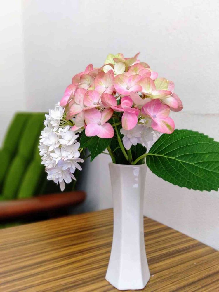 庭に咲いていた紫陽花が雨で倒れたので、切り花にして飾りました。