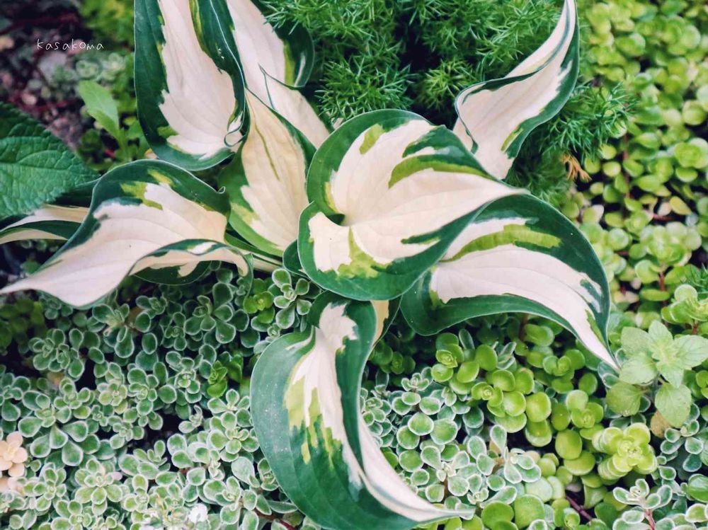 Kasakomaさんの小さな庭,ギボウシ(ホスタ),斑入り丸葉万年草の投稿画像