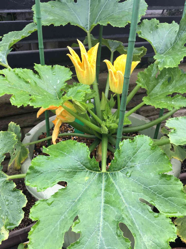 今朝見たらズッキーニ の雌花に加えて雄花もふたつ咲いていました👍😊☀️