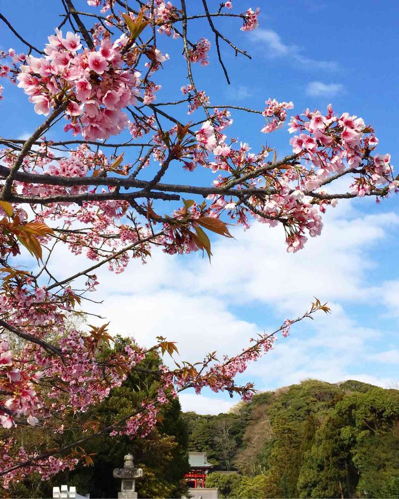 サクラの花と遠くに見える鶴岡八幡宮⛩