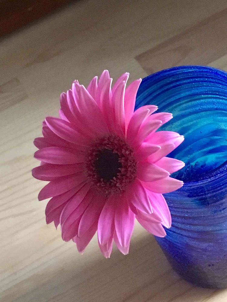 ピンクのガーベラが、青い器になんて映えること👍✿゚❀.(*´▽`*)❀.゚✿綺麗です。