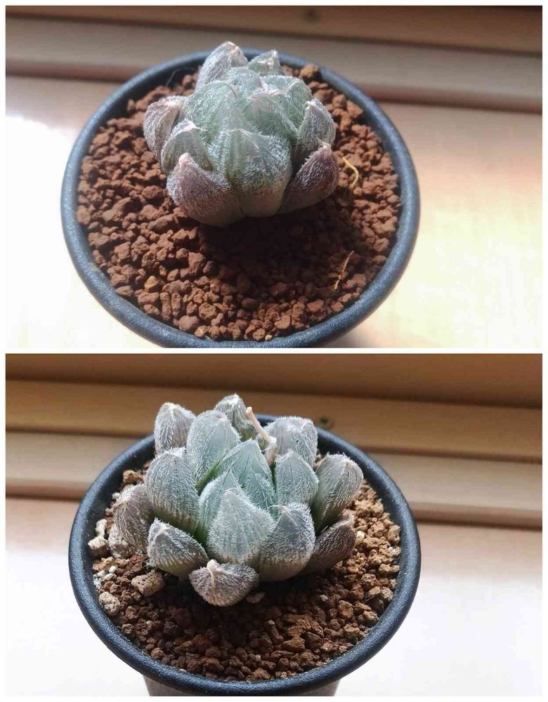 根が乾いていたせいかなかなか水を吸わず、潅水多め&日陰管理で外葉が緩むまで5週間⏳膨らみ始めるまで6週間⏳新しい葉を展開するまで7週間かかりました(´ε`;)