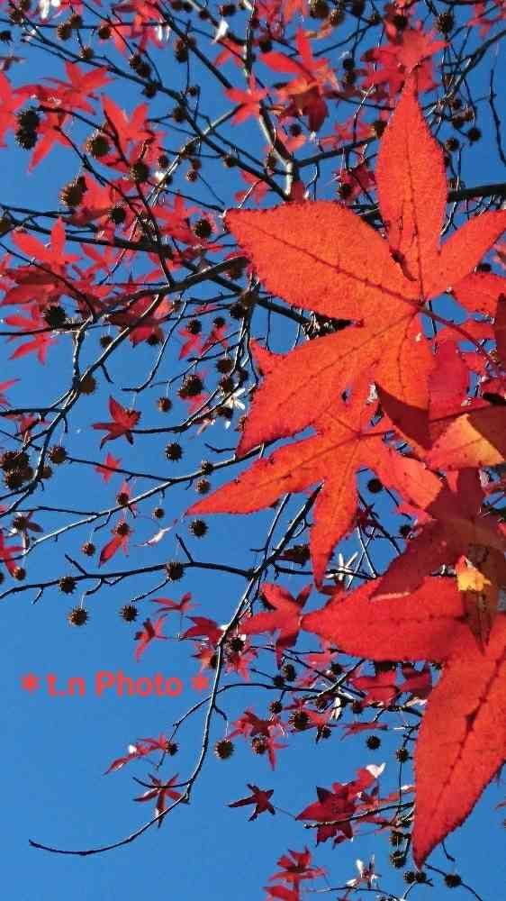 青空と真っ赤なモミジバフウ綺麗なコントラスト❣️