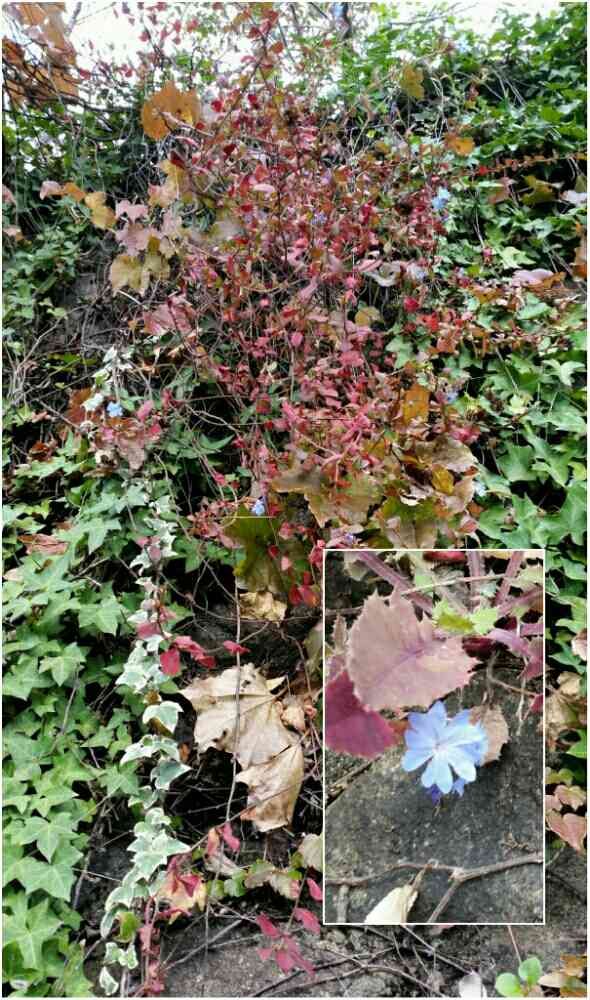赤く紅葉している中央の葉っぱがこの花の葉っぱでした。芝桜はトゲトゲの葉っぱなのでやはりルリマツリモドキ説が濃厚な気がします...!