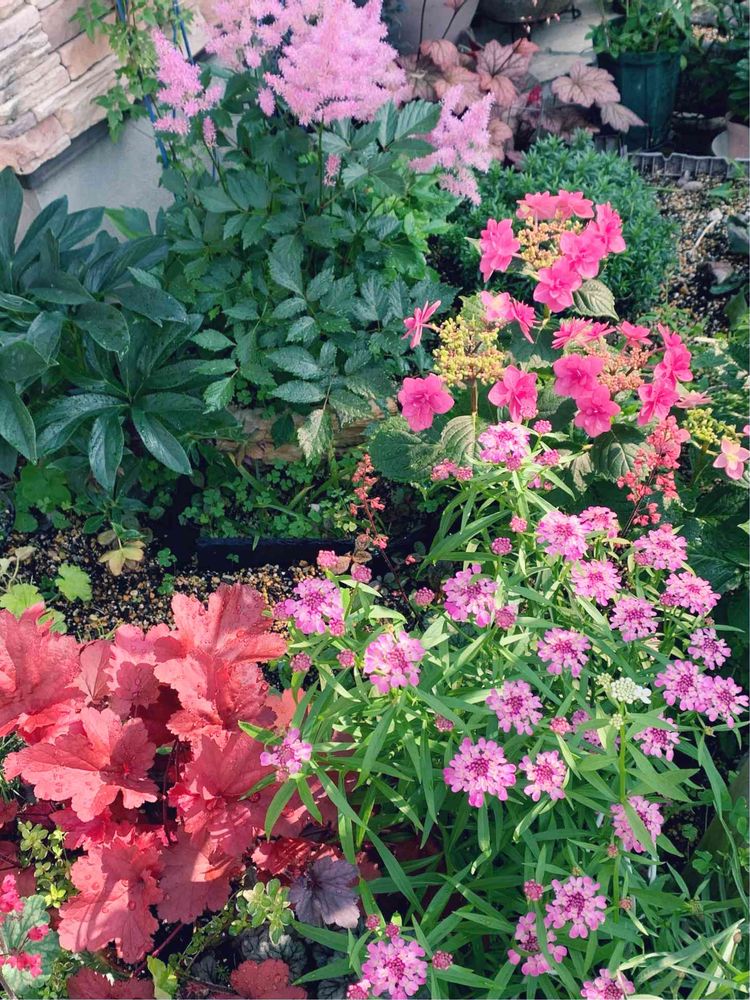アスチルベの手前にはアジサイ 美咲小町とイベリス キャンディタフトが咲き出してます🥰💕