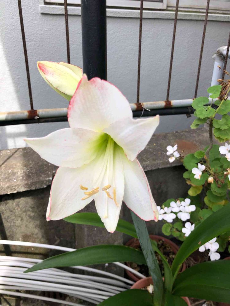 友達から頂いたアマリリスが咲きましたよ🎵😆✨白に少し赤が入る素敵な花でした‼️