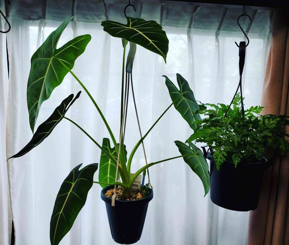 アロカシアの葉っぱがかなりの大きさになってカーテンに当たっております😂