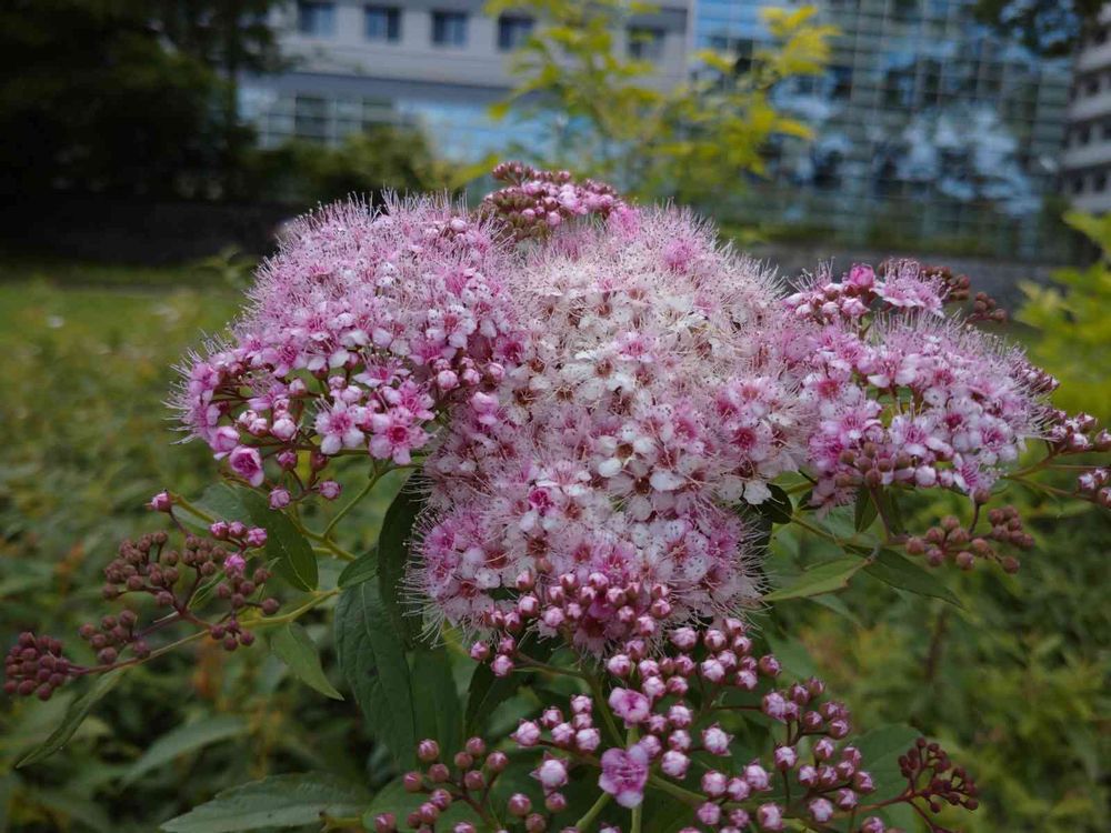 シモツケは去年GSで名前を教えてもらって覚えたお花です🌸 植え込みや街路樹の一部で見かけるので、雑草ではないと思います☺️ ほわほわが人気な理由かなぁ?