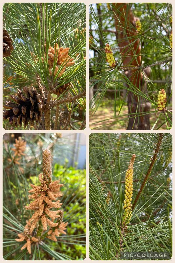 ただ、松は他家受粉で、先に咲いた雄花の花粉が風で漂い、雄花よりも高い位置にある雌花には他から流れてきたものが受粉するようです。